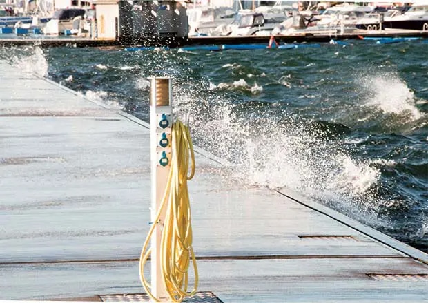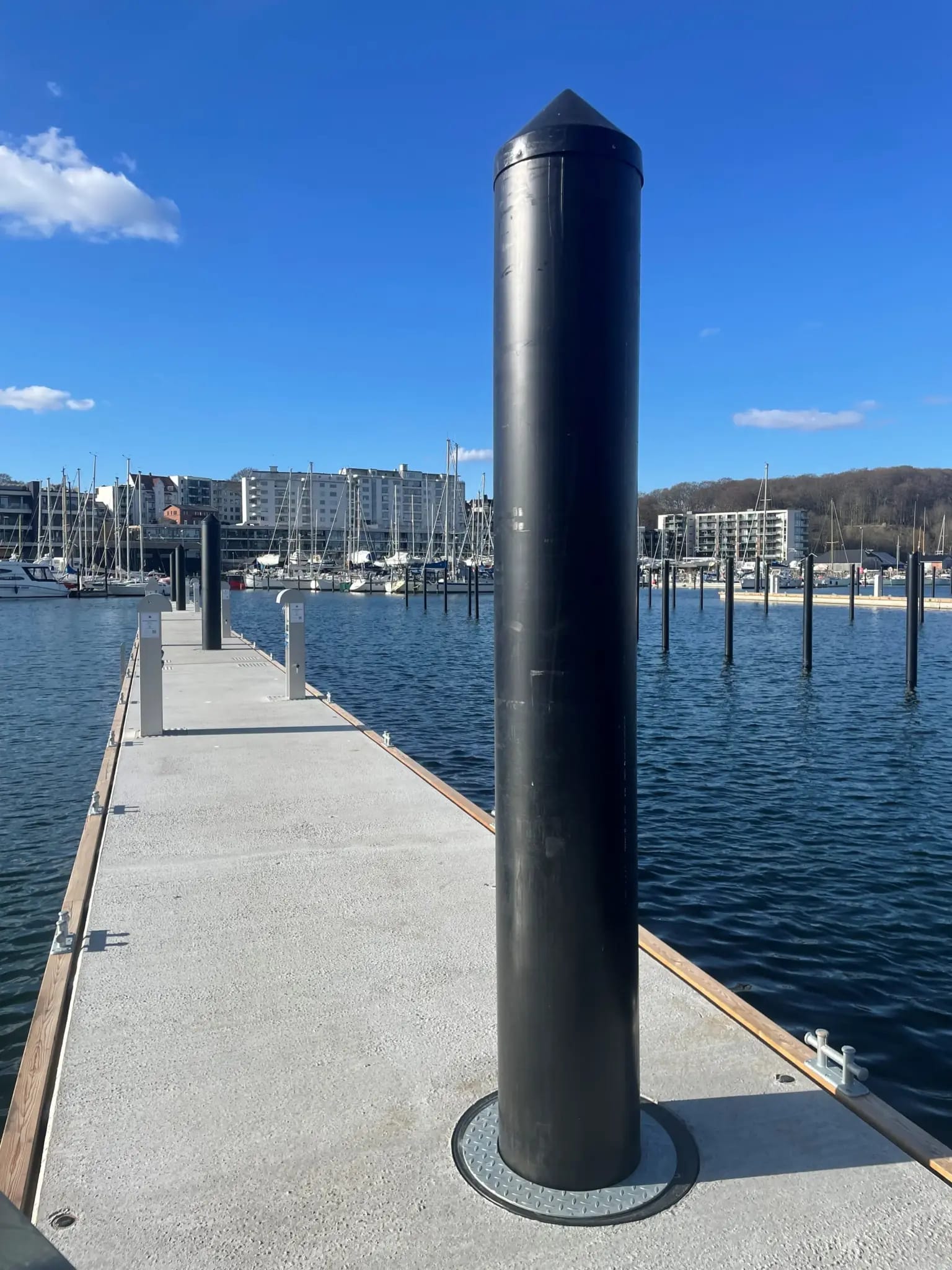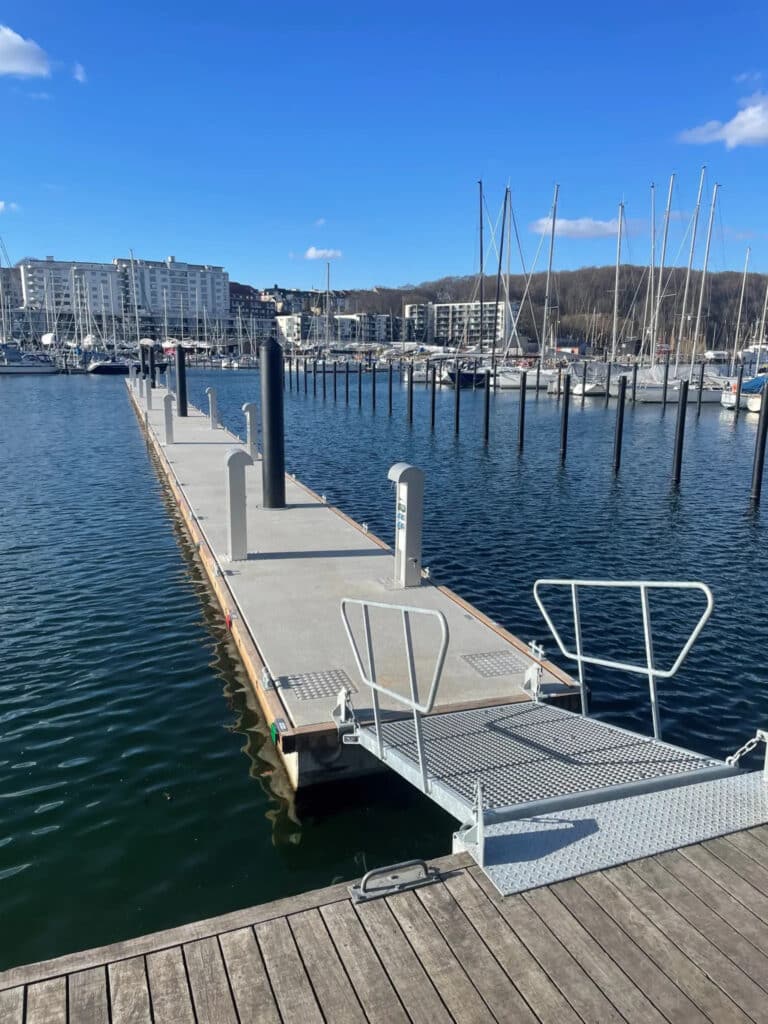 I en moderne havn monteres fortøjningsbomme på flydebroerne, således bådene ligger sikkert i havn.